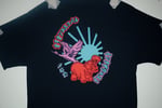 Water-based ink screen-pressed on 100% cotton tees.